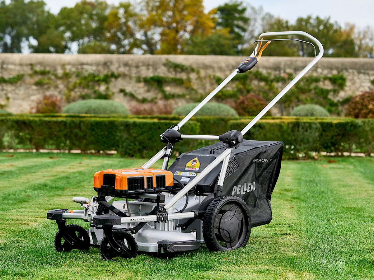 In Verbindung mit dem Akku ULiB 1500 erreicht der Akku-Rasenmäher Rasion 3 von Pellenc eine Flächenleistung von bis zu 5.400 m² beziehungsweise Laufzeiten von rund 5 h. Der bürstenlose Motor liefert bis zu 1.600 W Leistung, im Boost-Modus steigt die Messerdrehzahl auf 5.000 U/min zur Bearbeitung dichter Vegetation. Optional passt die Intelligent Cutting Control die Drehzahl per Infrarotsensor automatisch an die Vegetationsdichte an. Eine automatische Grasstaubeseitigung entfernt angesammeltes Schnittgut durch rückwärtslaufende Messer ohne Arbeitsunterbrechung. Die Schnitthöhe ist in acht Stufen von 30 bis 95 mm einstellbar. Zero-Turn-Fahrwerk, arretierbare Vorderräder und ein Aluminiumrahmen mit Schutzbumpern unterstützen präzises Arbeiten auf strukturierten Flächen.