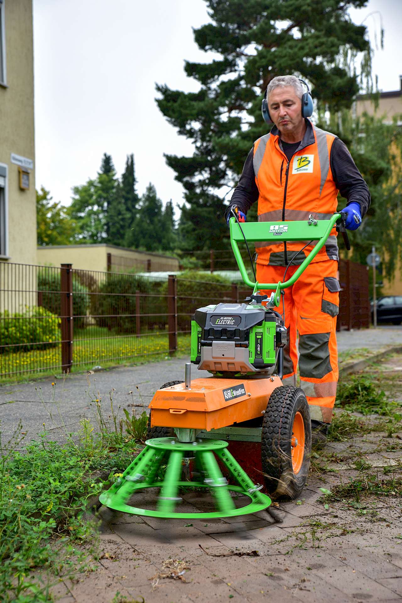 Ende Juli 2025 wurden die beiden Testkandidaten beim Baubetriebshof ausgeliefert: die elektrische AS 60 EWeedHex und die benzinbetriebene AS 60 WeedHex. Auf eine Einweisung hat der Hersteller AS-Motor bei diesem KT-PraxisTest verzichtet – die Geräte sind zum einen leicht zu bedienen, zum anderen verfügt der Baubetriebshof bereits über eine WeedHex, allerdings eine ältere Version mit kleinerer Arbeitsbreite. Die Spannung bei den Mitarbeitern, die mit den Geräten arbeiten sollten, war groß. Würden die neuen Weedhexen anders arbeiten? Und wie funktioniert ein Elektroantrieb unter diesen Einsatzbedingungen? Während des Testzeitraums bis Ende August, kamen die Geräte in Bushaltestellenbereichen, auf Parkplatzflächen und auf einer Sportplatztribüne zum Einsatz.