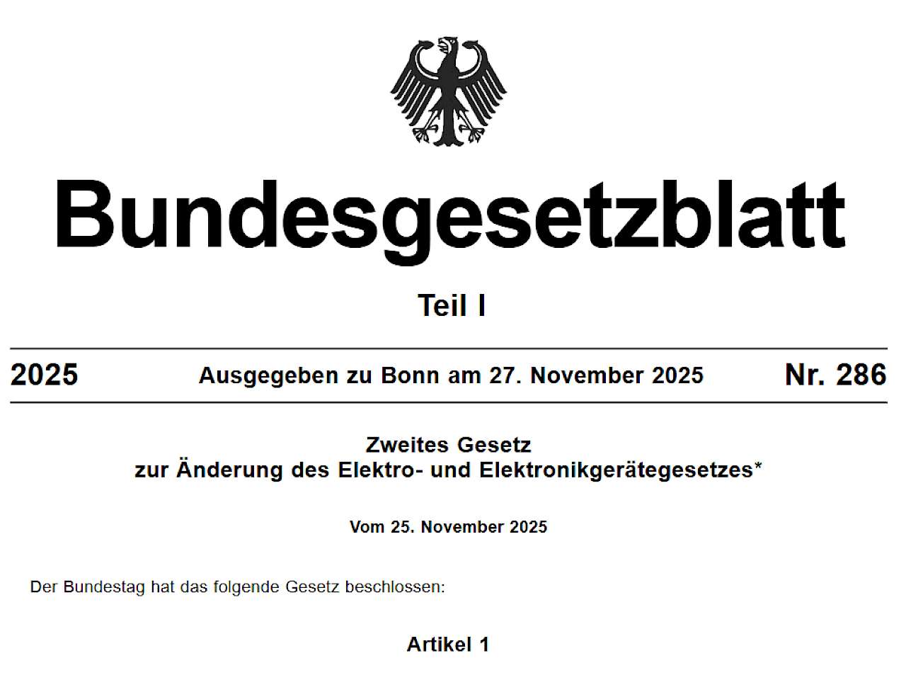 Die Anpassungen zum Elektrogesetz wurden am 27. November 2025 im deutschen Bundesgesetzblatt veröffentlicht. Große Teile des ElektroG4 treten am 1. Januar 2026 in Kraft. Die neuen Kennzeichnungs- und Rücknahmepflichten im Handel werden noch bis Mitte 2026 aufgeschoben.